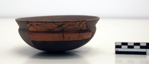 Coppa con breve labbro obliquo, distinto da una ripresa, con vasca emisferica leggermente compressa. Sulla superficie esterna: sull'orlo, sulla ripresa tra labbro e vasca, una linea a vernice nera; vasca, parte inferiore. Sulla superficie interna: interamente a vernice, a eccezione di una fascia risparmiata sotto l'orlo.