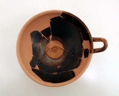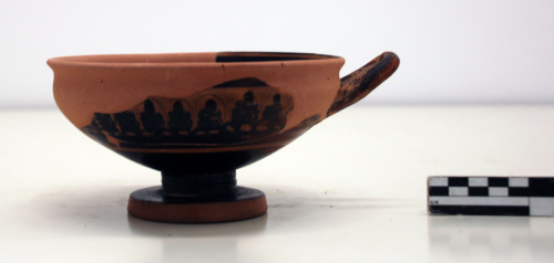 Coppa skyphoide con orlo distinto leggermente estroflesso, vasca profonda, ansa a bastoncello impostata obliquamente a metà della vasca, piede a disco con largo e corto stelo, con tracce della tornitura. Sulla superficie esterna: fascia di palmette e boccioli allungati su catena di circoli con punto centrale, con particolari incisi e sovradipinti in bianco e paonazzo, ora evanidi. Sul piede, in corrispondenza della costa e sotto di esso, fascia risparmiata. Decorazione di base e interno del piede, a vernice nera. Sulla superficie interna, sotto l'orlo, filetto risparmiato; sul fondo, tondo con punto e anello a vernice.
