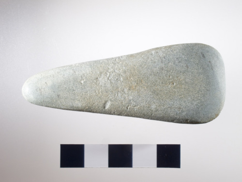 ascia di forma triangolare a sezione appiattita; levigata in prossimità del taglio e in corrispondenza di una delle facce del tallone, poco arcuato; il resto della superficie appare picchiettato