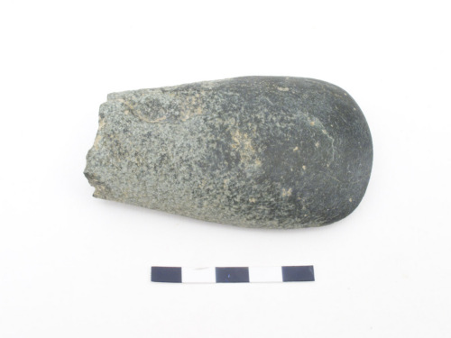 ascia a sezione asimmetrica piano-convessa; la superficie è levigata per i due terzi, picchiettata nella restante porzione, margini laterali arrotondati