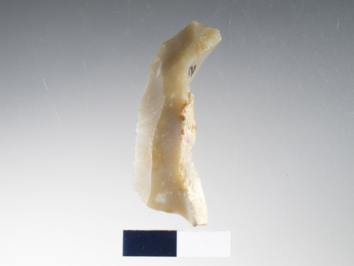 troncatura obliqua ad andamento irregolare su lama; conserva una piccola porzione del cortice