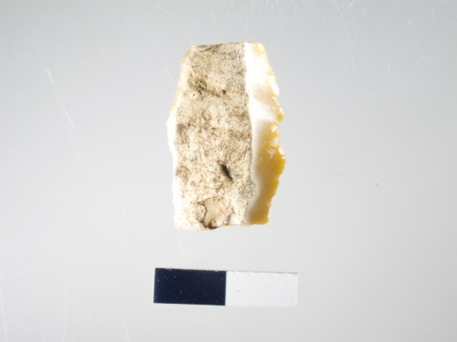 lama ritoccata; ritocco bilaterale tendente al denticolato; sulla faccia dorsale conserva il cortice