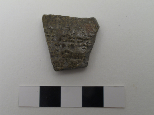 Frammento di invetriata in monocottura altomedievale. Il frammento è pertinente adun recipiente di forma chiusa, con una vetrina coprente, uniforme e brillante. Potrebbe trattarsi di un recipiente potorio. La vetrina, di colore verde/marrone, presenta alcuni vacuoli, mentre l'argilla si presenta ossidata nella parte interna e ridotta in frattura.