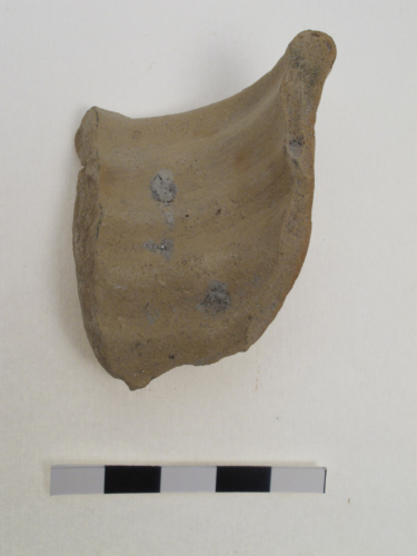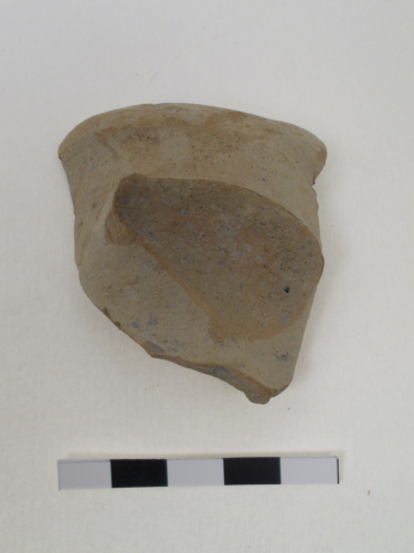 Frammento del collo con lattacco dellansa, a sezione ellittica, di unanfora globulare altomedievale, probabilmente di area dellItalia meridionale. Il frammento presenta il labbro è leggermente estroflesso, a sezione triangolare arrotondata. Largilla è di colore rosato, con molti inclusi bianchi e qualche incluso micaceo. Il manufatto presenta schiariture superficiali.
