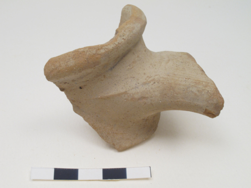 Frammento del collo con lattacco dellansa, a sezione ellittica, di unanfora globulare altomedievale, probabilmente di area dellItalia meridionale. Il frammento presenta il labbro è leggermente estroflesso, a sezione triangolare arrotondata. Largilla è di colore rosato tendente al rosso con molti inclusi bianchi e miche. Il manufatto presenta schiariture superficiali. Lansa è a bastoncello, con sezione ellittica. Sono presenti due leggere solcature sulla parte esterna dellansa.