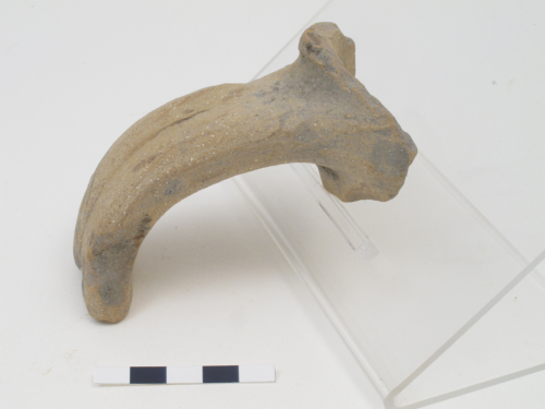 Ansa di anfora globulare con attacco appena sotto il labbro. Si tratta di un’anfora del tipo “globulare altomedievale”, probabilmente proveniente dall’area del Mediterraneo orientale. Ansa a nastro piuttosto sottile, con una curvatura a gomito. Presenta una insellatura mediana ben definita. Impasto di colore marrone chiaro, con cottura ad effetto "sandwich", con miche e inclusi bianchi.