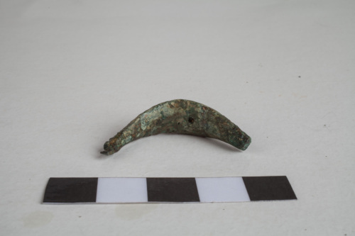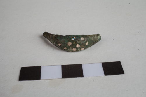 frammento di arco di fibula a sanguisuga; sull'arco sono presenti motivi decorativi costituiti da impressioni circolari riempite di pasta bianca e fasci di sottili incisioni parallele