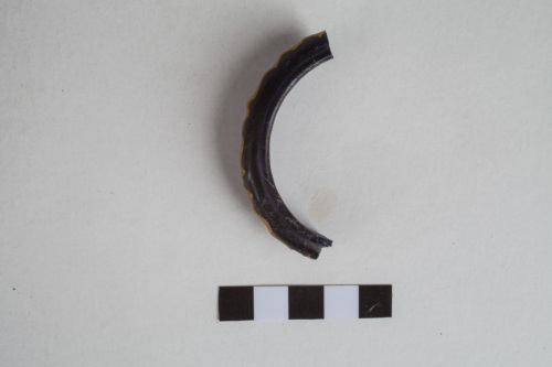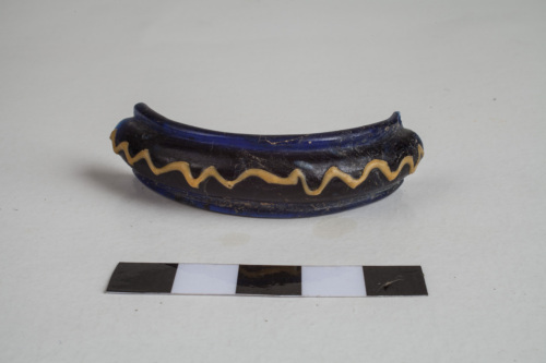armilla di vetro blu scuro; sezione ingrossata; decorazione costituita da un sottile filamento disposto a zig-zag in pasta vitrea di colore giallo