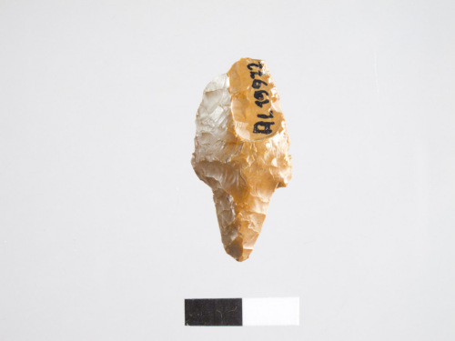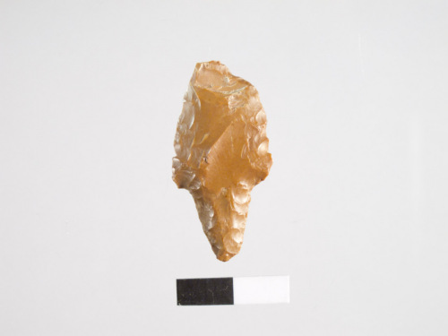 punta di freccia foliata e peduncolata con ritocco tendenzialmente coprente bifacciale; selce di colore marrone