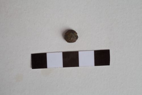 piccola borchia in bronzo e osso di forma circolare a sezione piano convessa con anello di sospensione