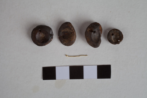 quattro bottoni di forma circolare e sezione concava-convessa con foro passante, in ambra associati ad un filo in oro