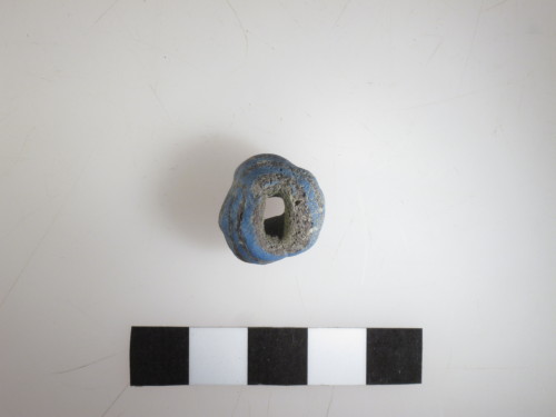 Perla tondeggiante medio grande in pasta vitrea bruna, costolature irregolari su tutto il corpo e decorazione inserita spiraliforme turchese ad avvolgimenti piuttosto ravvicinati. Tipo C Gambacurta G. 1987: "perle costolate con decorazione spiraliforme".