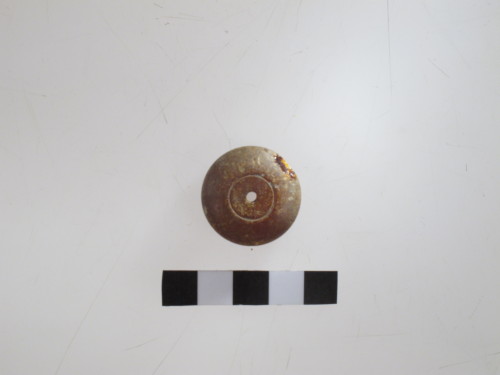 Disco in ambra di forma circolare appiattita con foro centrale; decorazione incisa costituita da uno (lato A) e due cerchi concetrici (lato B)