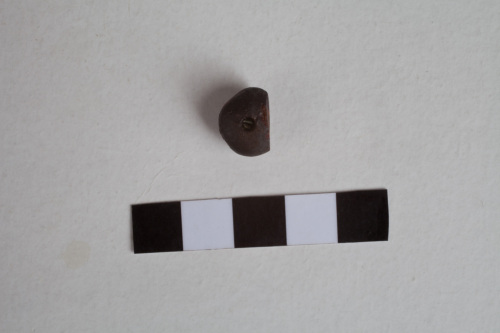 perla in ambra di forma sferica schiacciata con foro centrale nel quale è ancora conservato parte del filo di bronzo