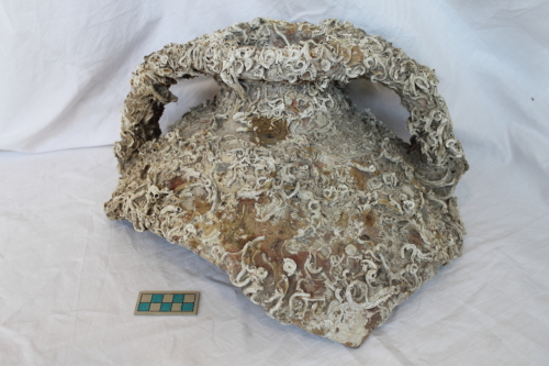Parte superiore d'anfora con collo tozzo e molto corto, orlo a profilo modanato ma superiormente ampio e piatto. La spalla è fortemente bombatae fa impercettibilmente posto al ventre, che si è conservato solo in piccola parte. Le anse sono impostate sull'orlo, facendo corpo con esso, poi si allontanano per formare un ampio gomito ad angolo ottuso.