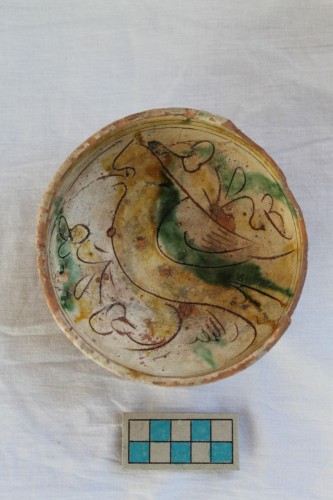 scodella con piede ad anello e fondino leggermente umbonato, corpo a profilo emisferico schiacciato, orlo diritto indistinto, assottigliato e leggermente appiattito superiormente. All'interno, il decoro è rappresentato da un uccello stilizzato solto a destra, racchiuso entro una cornice di linee parallele che si sviluppano poco al di sotto dell'orlo. Lo spazio di risulta è campito da elementi vegetali molto stilizzati.