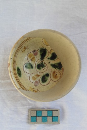 scodella con piede ad anello e fondino leggermente umbonato, corpo a profilo emisferico schiacciato, orlo leggermente obliquo e labbro assottigliato. All'interno del cavetto compare un grande fiore con otto petali, alternativamente marcati da pennellate di colore verde e giallo. Nello spazio di risulta tra il fiore e il bordo sono presenti delle spiralette che presentano la medesima alternanza cromatica.