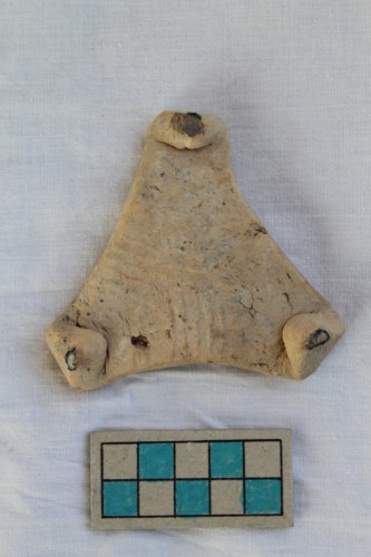 Distanziatore di cottura di forma irregolarmente triangolare, caratterizzato da una punta rilevata posizionata in corrispondenza di ogni vertice. Il treppiede era funzionale alla cottura delle ceramiche impilate all'interno del forno che, in assenza di un elemento separatore e per lo scioglimento del rivestimento vetroso, si sarebbero saldate tra loro.