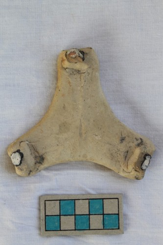 Distanziatore di cottura di forma irregolarmente triangolare, caratterizzato da una punta rilevata posizionata in corrispondenza di ogni vertice. Il treppiede era funzionale alla cottura delle ceramiche impilate all'interno del forno che, in assenza di un elemento separatore e per lo scioglimento del rivestimento vetroso, si sarebbero saldate tra loro.