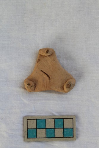 Distanziatore di cottura di forma irregolarmente triangolare, caratterizzato da una punta rilevata posizionata in corrispondenza di ogni vertice. Il treppiede era funzionale alla cottura delle ceramiche impilate all'interno del forno che, in assenza di un elemento separatore e per lo scioglimento del rivestimento vetroso, si sarebbero saldate tra loro.