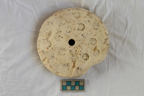 Peso di forma discoidale, caratterizzato al centro da un foro circolare passante funzionale alla sua sospensione sul telaio. La superficie superiore è caratterizzata da numerose punzonature circolari, impresse con casualità, che racchiudono un motivo a stella.