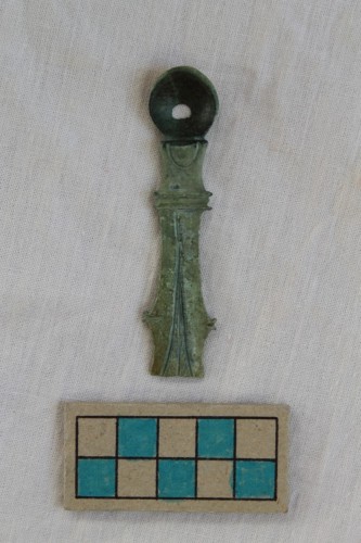 Parte terminale del manico di un probabile cucchiaio o mestolo, composto da una lamina di bronzo sagomata a losanga, con inflorescenze stilizzate e rilevate in corrispondenza degli apici, una nervatura rilevata e una terminazione a paletta circolare leggermente concava . Al centro dell'impugnatura è presente un'incisione triangolare non meglio identificabile.