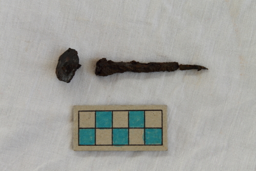 Chiodo frammentato in diversi elementi non combacianti, con larga testa a sezione globulare schiacciata e gambo a sezione quadrangolare.