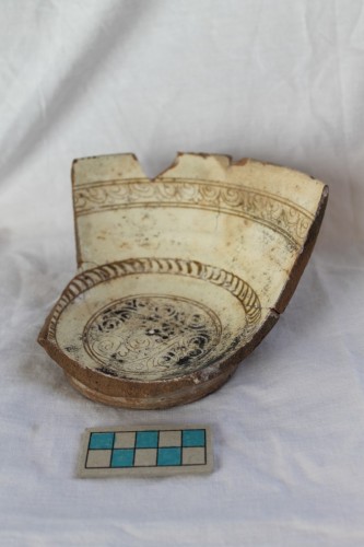 scodella con piede ad anello, corpo a profilo tronco-conico, orlo indistinto e labbro assottigliato. All'interno del cavetto compare un medaglione che racchude un motivo floreale stilizzato mentre nello spazio di risulta tra il cavetto e l'orlo sono presenti due fasce concentriche; la prima è campita con brevi trattini obliqui, la seconda, più larga, racchiude un racemo floreale stilizzato corrente.