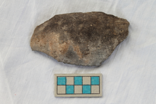 Frammento di scodella, di cui si conserva una porzione della vasca a profilo troncoconico lievemente arcuato e breve orlo rientrante. La superficie del reperto risulta lisciata.