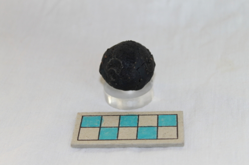 Sferetta di forma irregolare. Il suo notevole peso specifico indica che il manufatto sia probabilmente costituito da un'anima metallica rivestita esternamente da un guscio di pasta di vetro di colore blu scuro. Il reperto è forse da ricondurre ad un oggetto di ornamento.