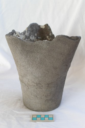 Crogiuolo per fusione dei metalli, con piede a disco, corpo a profilo tronco-conico che termina con una bocca quadrata.