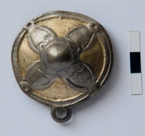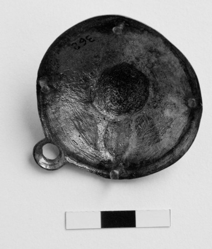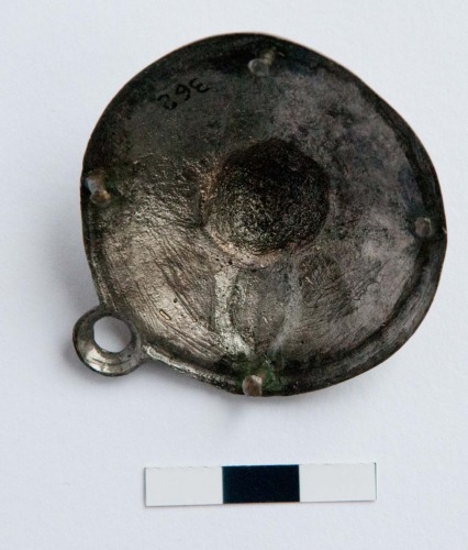 La borchia era fissata alle cinghie attraverso quattro chiodini ancora bene conservati nel retro del manufatto. Locchiello inferiore doveva servire per appendere alcuni elementi decorativi in materiale deperibile. La decorazione della borchia è riferibile al tipo a rosetta, ovvero del tipo Rosettenbeschläge.