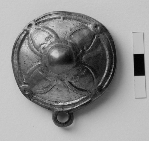Grande borchia in argento fuso, con umbone centrale, pertinente ad un finimento equino di proprietà femminile, rinvenuta nella Tomba n. 2 di Piliny-Leshegy (Ungheria).