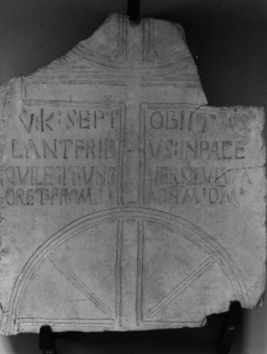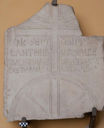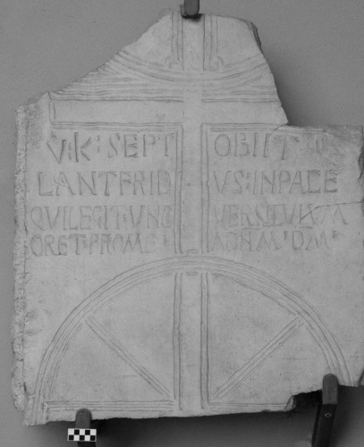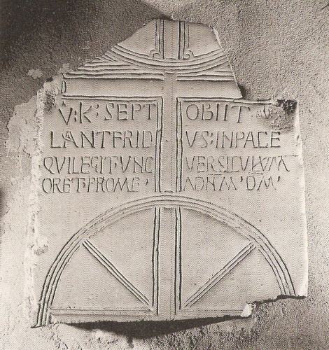 Sopra questo Chrismon vi è lo specchio epigrafico con liscrizione di Lantfrido che si rivolge a chi legge e chiede una preghiera (unc versiculum).