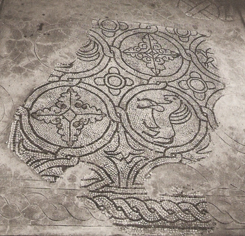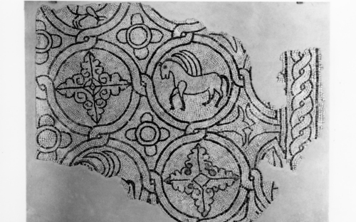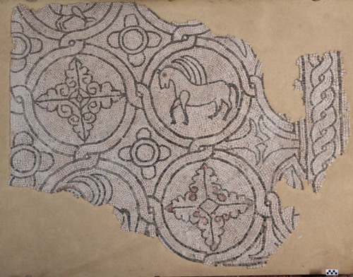 mosaico con tessere di marmo/ calcare bianco/ calcare bituinoso scuro/ terracotta rossa