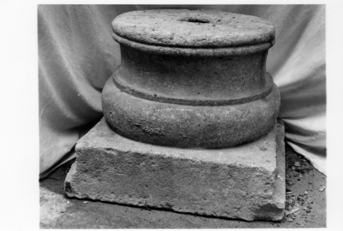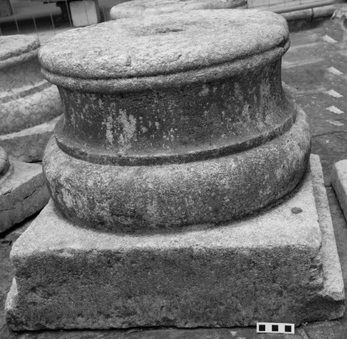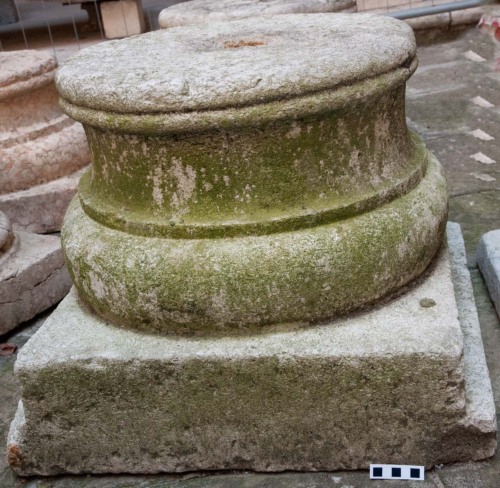 Base di colonna in broccatello giallo di Verona, con alto plinto rettangolare (il più alto di tutte le basi di colonna provenienti da SantIlario), affiancato da due listelli alla base. Vi è unampia scozia tra un toro semicircolare e una coppia di tori, in alto, appena segnati. Il toro inferiore è molto spesso e tra questo toro e la scozia si distingue un listello. Presente un incavo pseudo quadrato per il fissaggio della colonna stessa, e un piccolo canalino per facilitare le operazioni di ammorsamento tra colonna e base. La base di colonna presenta stringenti confronti con le colonne di XIII secolo impiegate nel Chiostro di Santa Apollonia, adiacente alla fabbrica marciana. Può essere associata stilisticamente alle basi di colonna MAV 863, 864, 865, 866, 867, 868, 869.