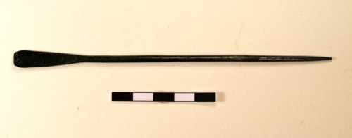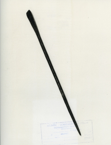Stilo in bronzo con corpo a sezione circolare; l'estremità opposta alla punta è conformata a spatolina.