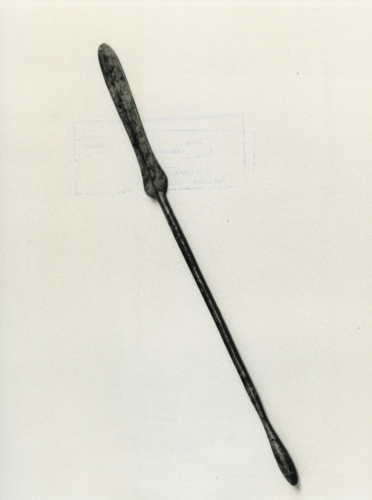 Sonda con stelo a sezione circolare, terminante ad oliva da un lato e con una spatola lanceolata, a foglia, divsa in due da una costolatura centrale, dal lato opposto. Prima dell'oliva, restringimento nella diametro dello specillo.