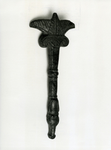 A metà del manico vi è un nodo a sezione circolare, compreso tra due anelli. Un terzo anellino è presente prima della protome di animale.