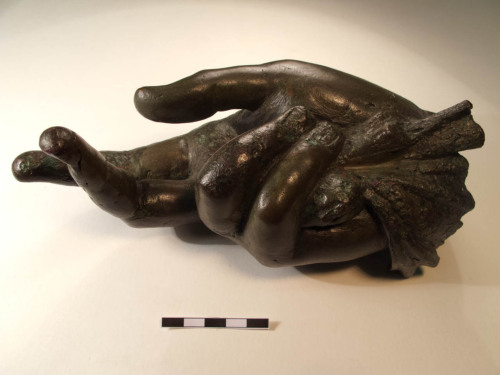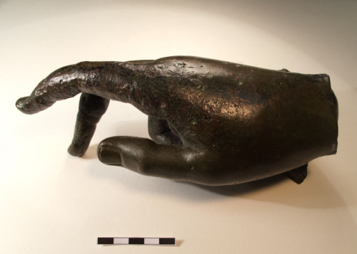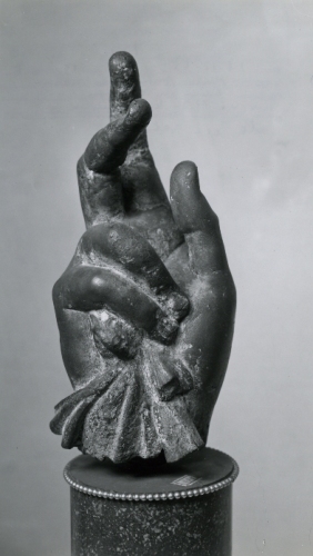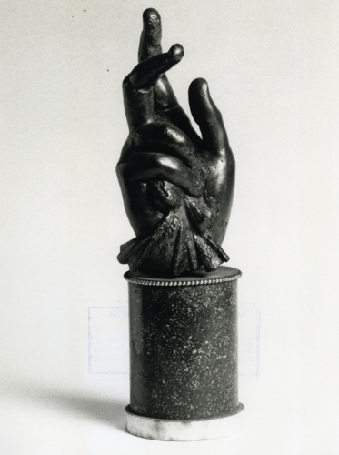 Mano in bronzo raffigurata nel gesto di benedire. Il pollice, l'indice e il medio sono semitesi, mentre anulare e mignolo sono ripiegati verso il palmo della mano. Mignolo e anulare reggono un piccolo lembo di stoffa.