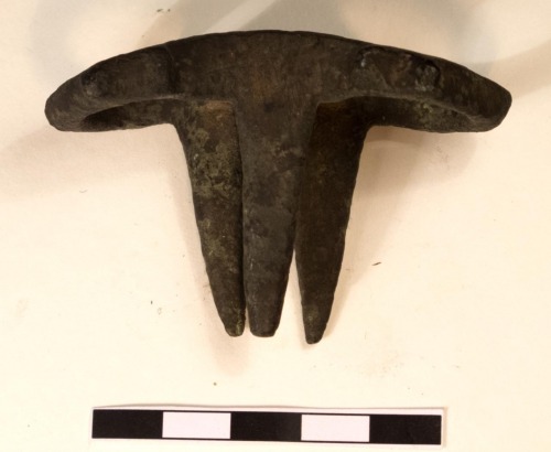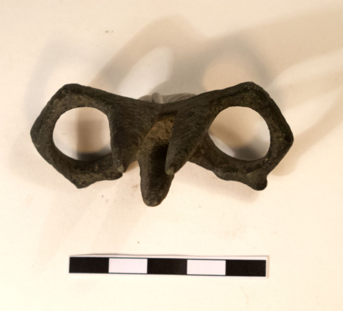 Anello gemino tricuspidato in bronzo, formato da due elementi anulari cilindrici, raccordati da un corpo mediano sormontato da tre cuspidi: una più larga, a base triangolare, e due più sottili affiancate, di forma piramidale. Gli anelli all'esterno hanno una forma pentagonale e presentano deboli ispessimenti rettangolari sulla parte frontale.