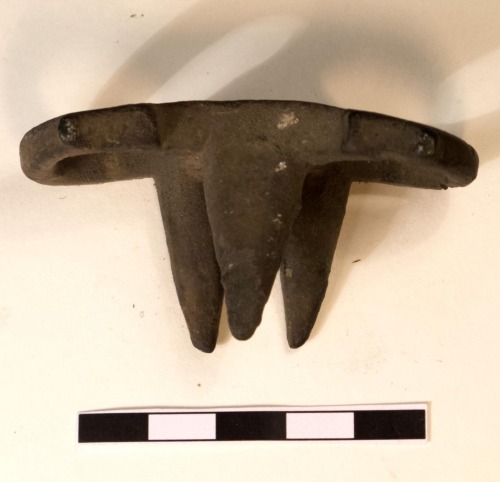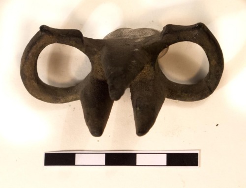 Anello gemino tricuspidato in bronzo, formato da due elementi anulari cilindrici, raccordati da un corpo mediano sormontato da tre cuspidi: una più larga, a base triangolare, e due più sottili affiancate, di forma piramidale. Gli anelli presentano deboli ispessimenti rettangolari sulla parte frontale.