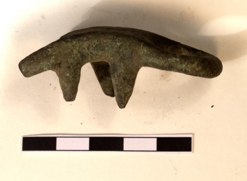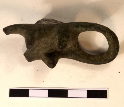 Anello gemino tricuspidato in bronzo, formato da due elementi anulari cilindrici, raccordati da un corpo mediano sormontato da tre cuspidi: una più larga, a base triangolare, e due più sottili affiancate, di forma piramidale. Gli anelli presentano deboli ispessimenti rettangolari sulla parte frontale.