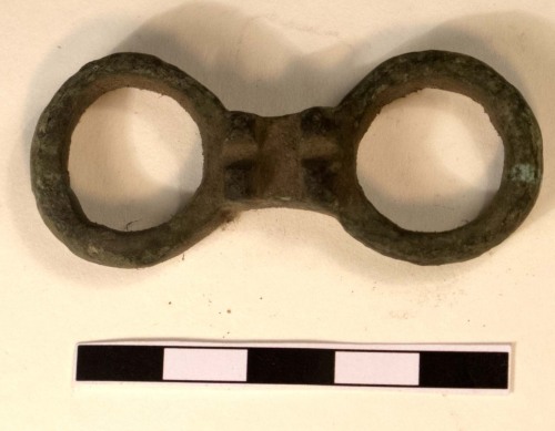 Anello gemino tricuspidato in bronzo, formato da due elementi anulari cilindrici, raccordati da un corpo mediano sormontato da quattro cuspidi: a base quadrata di forma piramidale. Gli anelli presentano deboli ispessimenti rettangolari sulla parte frontale.
