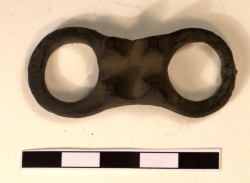 Anello gemino tricuspidato in bronzo, formato da due elementi anulari cilindrici, raccordati da un corpo mediano sormontato da quattro cuspidi: a base quadrata di forma piramidale. Gli anelli presentano deboli ispessimenti rettangolari sulla parte frontale.