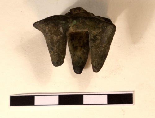 Anello gemino tricuspidato in bronzo, formato da due elementi anulari cilindrici, raccordati da un corpo mediano sormontato da tre cuspidi: una più larga, a base triangolare, e due più sottili affiancate, di forma piramidale. Gli anelli sono entrambi frammentari.