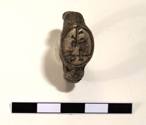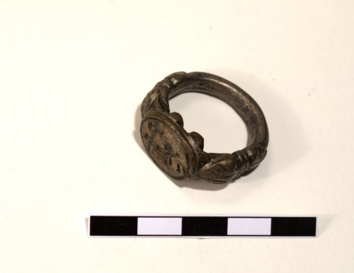 Anello digitale, a verga circolare piena, del tipo a castone con sigillo. La verga è a sezione ellittica piena, decorata da due nodi e fogliette prima del castone da entrambi i lati. Il castone ovale, è inciso sul metallo con tre gruppi di lettere, probabilmente legate alla figura di un vescovo.