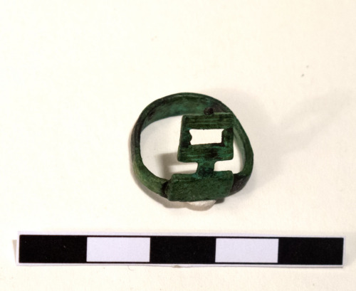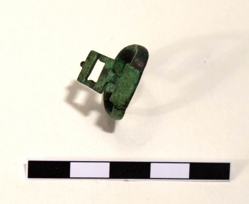 Anello digitale, a chiave, formato da una fascia in lega di rame, a capi saldati in prossimità del decoro. La fascia è un nastro semplice. Il decoro, sormontante, è formato da un rettangolo forato a forma di rettangolo di piccole dimensioni.