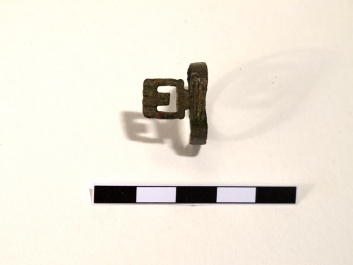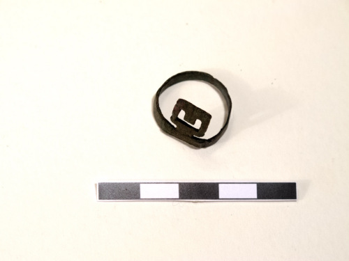 Anello digitale, a chiave, formato da una fascia in lega di rame, a capi saldati in prossimità del decoro. La fascia è un nastro semplice. Il decoro, sormontante, è formato da un rettangolo forato a forma di "U".
