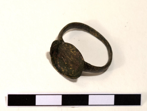 Anello digitale, a castone. Verga appiattita di tipo semplice, sormontata da castone appiattito di forma circolare, di cui si è persa la pietra e/o la pasta vitrea.